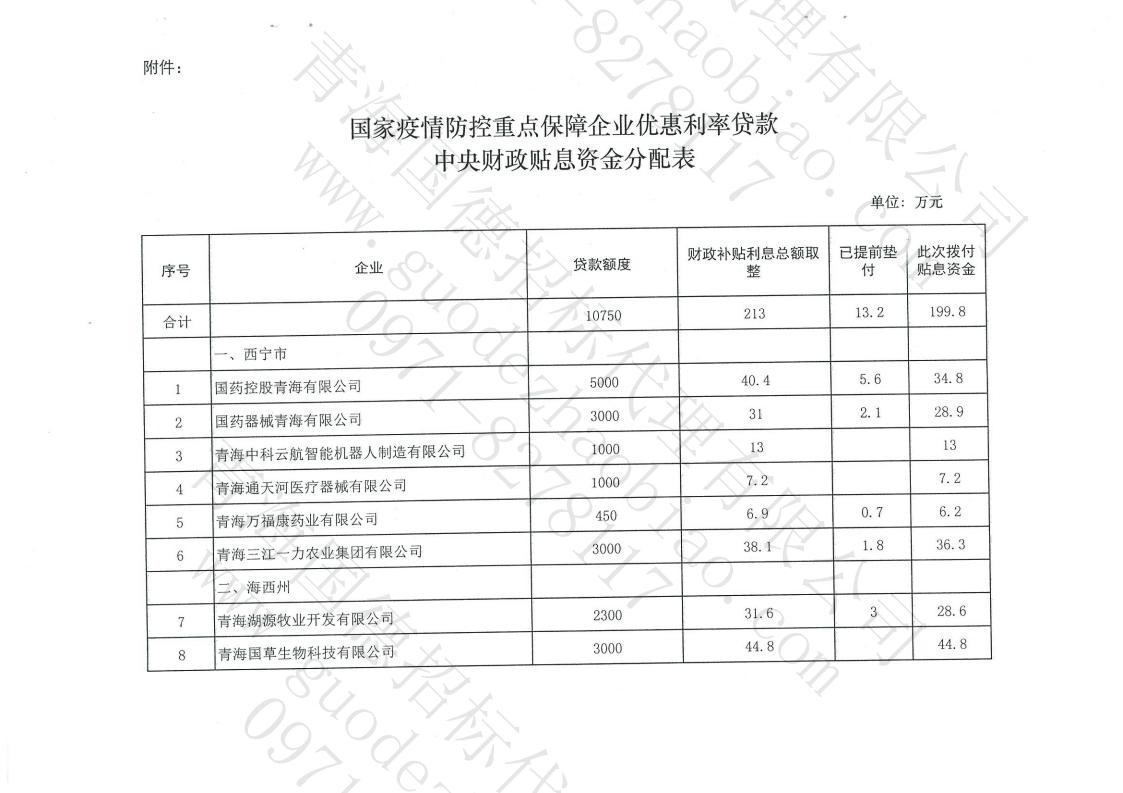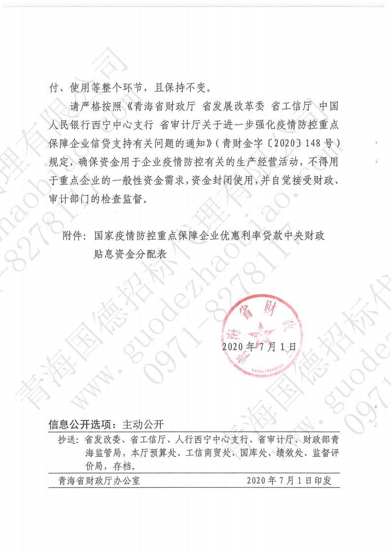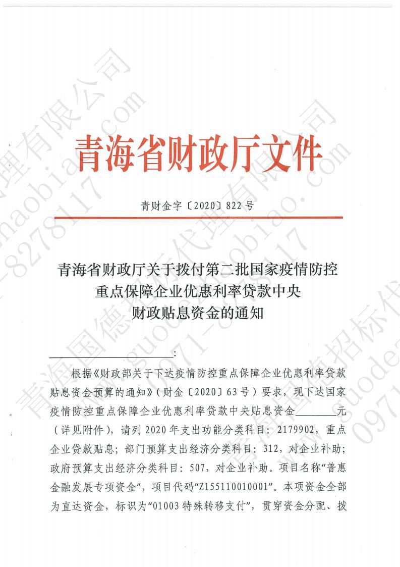 青財(cái)金字[2020]822號(hào) 青海省財(cái)政廳關(guān)于撥付第二批國(guó)家疫情防控重點(diǎn)保障企業(yè)優(yōu)惠利率貸款中央財(cái)政貼息資金的通知