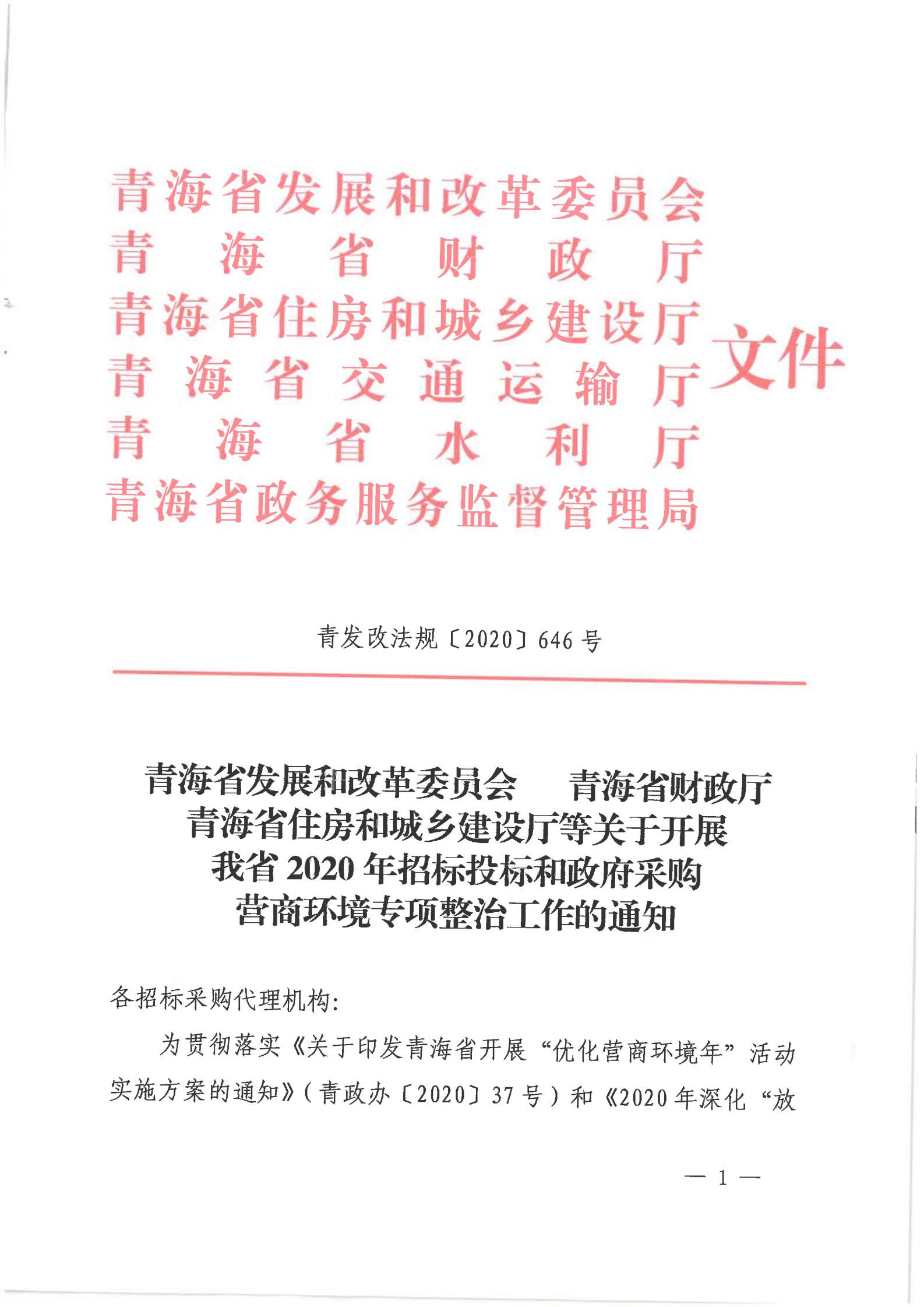 青海省發(fā)展和改革委員會(huì)青海省財(cái)政廳青海省住房和城鄉(xiāng)建設(shè)廳等關(guān)于開(kāi)展我省2020年招標(biāo)投標(biāo)和政府采購(gòu)營(yíng)商環(huán)境專項(xiàng)整治工作的通知