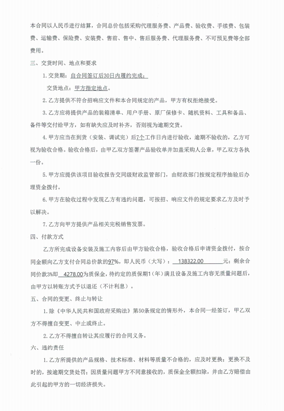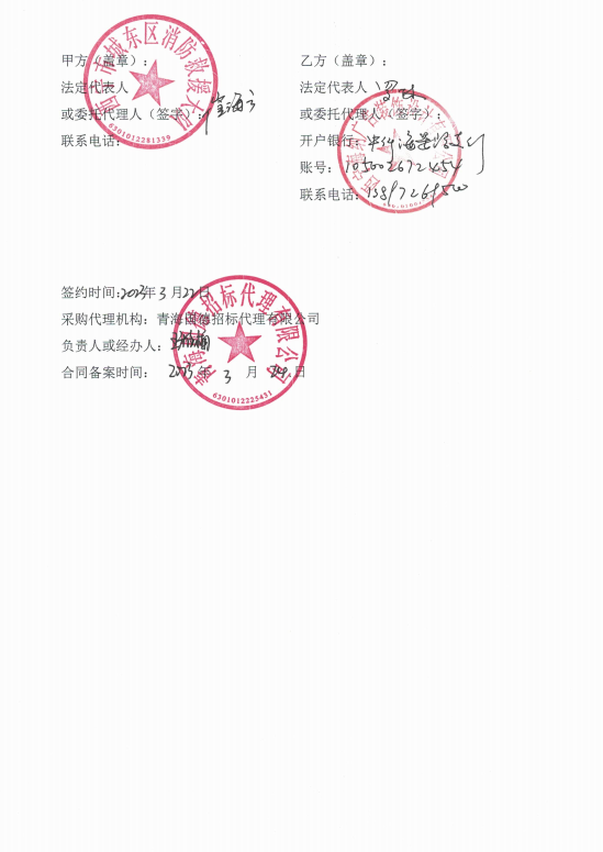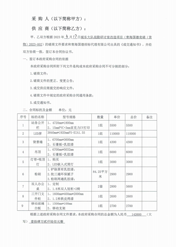 一、合同編號:QHGD-2023-002號 二、合同名稱:城東大隊?wèi)?zhàn)勤研討室改造項目的合同 三、項目編號:青海國德競磋(貨物)2023-002 四、項目名稱:城東大隊?wèi)?zhàn)勤研討室改造項目 五、合同主體 采購人(甲方):西寧市城東區(qū)消防救援大隊 地 址:西寧市城東區(qū)湟中路300號 聯(lián)系方式:0971-8136896 供應(yīng)商(乙方):西寧海納廣告裝飾設(shè)計有限公司 地 址:青海省西寧市城北區(qū)海西路59號45號樓59-201號 聯(lián)系方式:13897269500 六、合同主體信息 1.主要標(biāo)的信息: 主要標(biāo)的名稱:城東大隊?wèi)?zhàn)勤研討室改造項目 數(shù)量:1.00 單價(元):142600.00 規(guī)格型號(或服務(wù)要求):品牌:詳見附表;規(guī)格型號:詳見附表 2.合同金額(元):142600.00 3.履約期限、地點等簡要信息:甲方指定地點 自合同簽訂后30日內(nèi)履約完成 4.采購方式:競爭性磋商 七、合同簽訂日期:2023年03月22日 八、合同公告日期:2023年03月24日 九、其他補充事宜:/