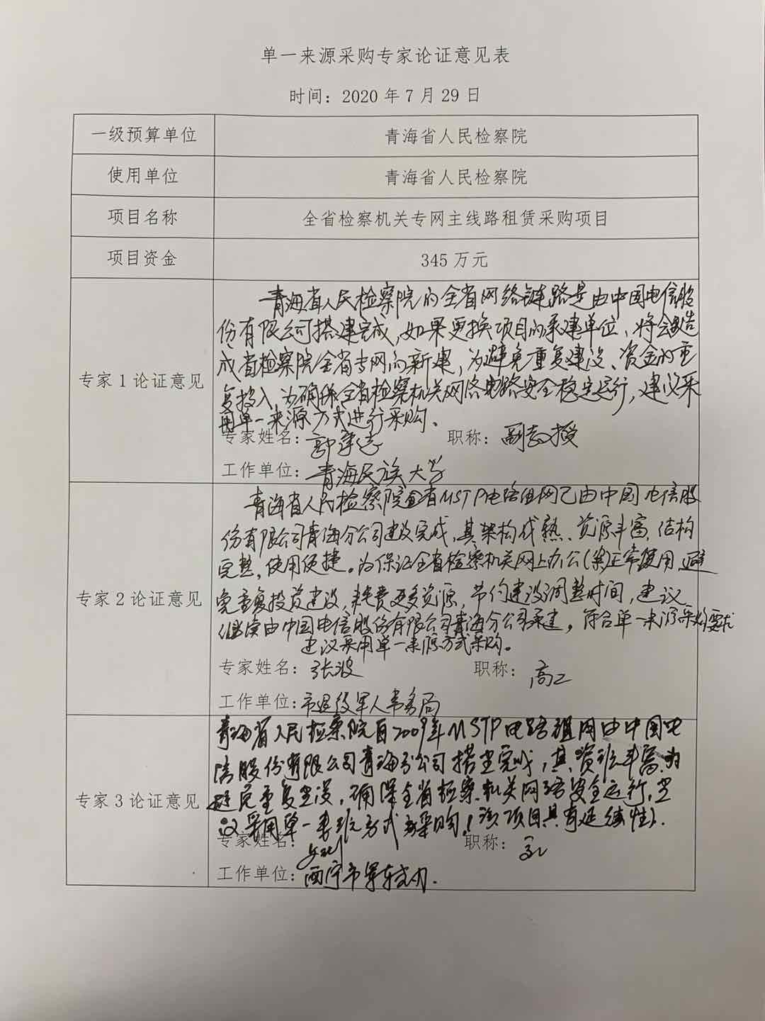 擬采購的貨物或服務的預算金額(元): 3450000 采用單一來源采購方式的原因及說明: 青海省人民檢察院申請“全省檢察機關(guān)專網(wǎng)主線路租賃項目”擬采用單一來源方式采購,申請理由如下:自2009年起,全省MSTP電路組網(wǎng)由中國電信股份有限公司青海分公司搭建完成,隨著檢察業(yè)務技術(shù)發(fā)展,2018年起采用點對點IPRAN組網(wǎng)方式,省級院、市州院、鐵檢院、西平檢察院檢察專網(wǎng)及工作網(wǎng)電路帶寬提升至200M電路;各區(qū)縣院、派駐檢察室、軍事檢察院電路帶寬提升至100M;本項目建設主要是在現(xiàn)有電路基礎上進行改造和擴容,選擇青海電信進行項目建設,有利于保證項目建設的前后銜接性和售后服務的保障,有利于控制項目建設節(jié)點和進度,有效降低項目成本;因涉及主線路電路架構(gòu)的完整性和持續(xù)性,對于該架構(gòu)的建設方中國電信股份有限公司青海分公司擁有不可替代的架構(gòu)熟悉程度,是其他同行業(yè)無法短時間內(nèi)實現(xiàn)的,為了不影響全省檢察系統(tǒng)的正常運作,建議繼續(xù)由中國電信股份有限公司青海分公司承建此項目。 二、擬定供應商信息 名稱: 中國電信股份有限公司青海分公司 地址: 青海省西寧市金匯路29號 三、公示期限 2020年07月29日 至 2020年08月05日 四、其他補充事宜 / 五、聯(lián)系方式 1.采購人信息 名 稱: 青海省人民檢察院 聯(lián)系人:鄧玢 聯(lián)系電話: 6304376 傳 真: / 地 址: 青海省西寧市五四西路17號 名 稱: 青海省財政廳政府采購監(jiān)督管理處 聯(lián)系人 : 李強 監(jiān)管部門電話:0971-6367644 傳 真: 0971-6159677 地 址: 青海省西寧市黃河路30號 附件信息: