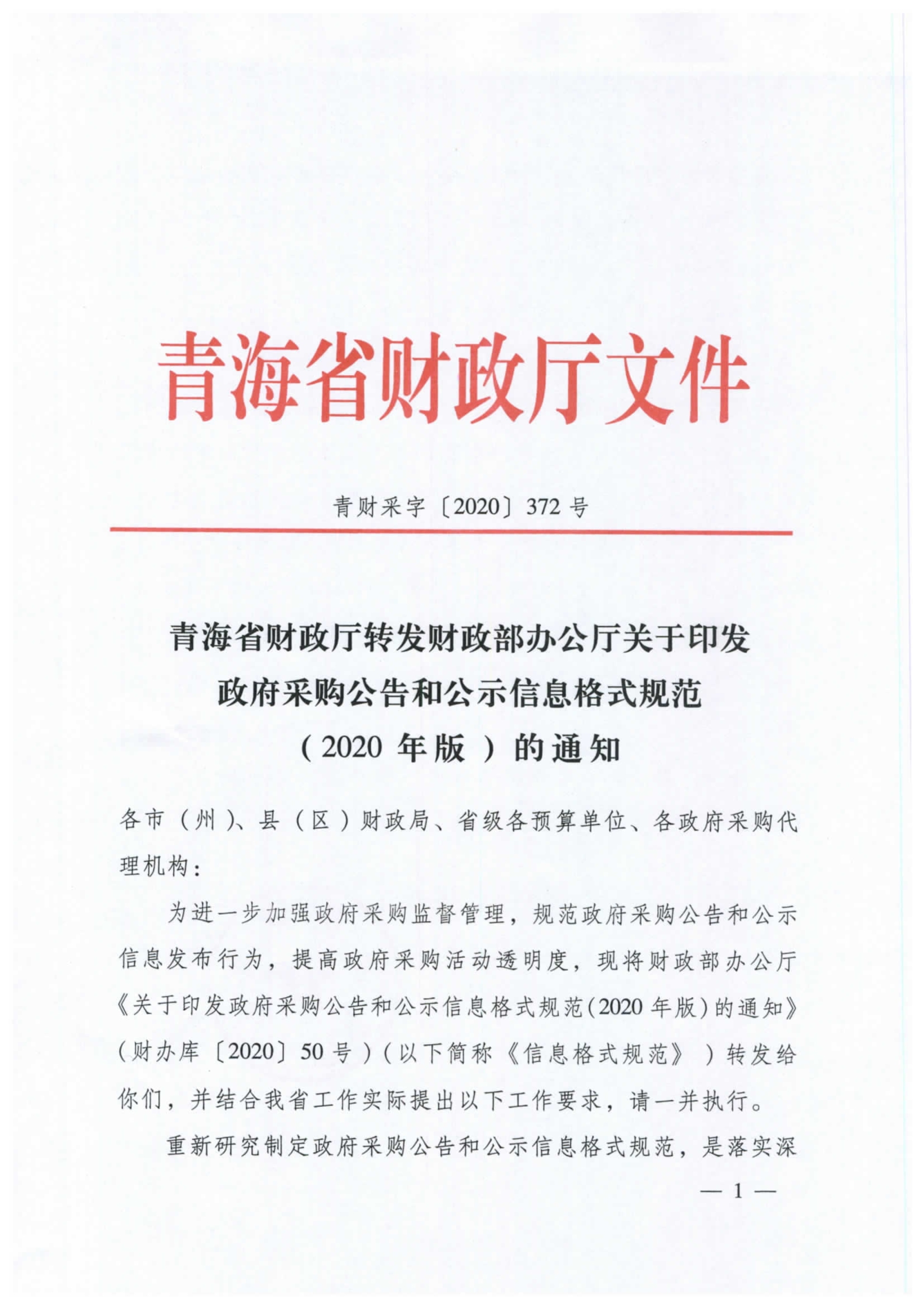 《青海省財政廳轉(zhuǎn)發(fā)財政部辦公廳關(guān)于印發(fā)政府采購公告和公示信息格式規(guī)范(2020年版)的通知》
