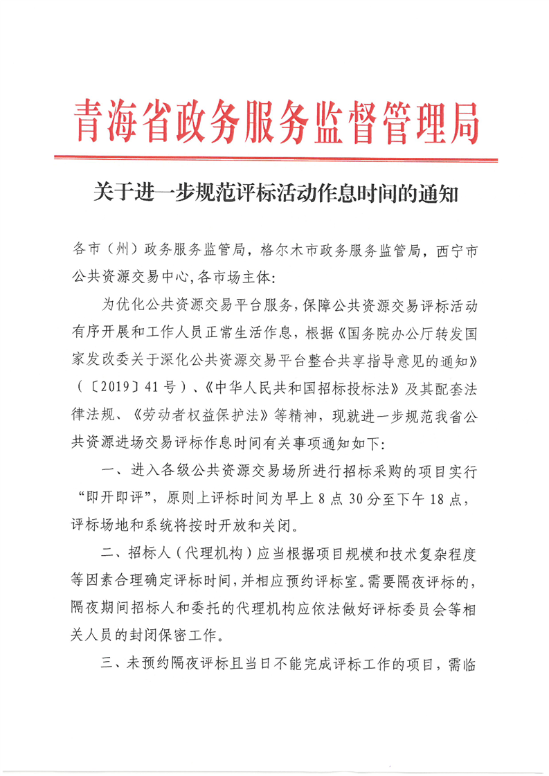 青海省政務(wù)服務(wù)監(jiān)督管理局關(guān)于進(jìn)一步規(guī)范評(píng)標(biāo)活動(dòng)作息時(shí)間的通知