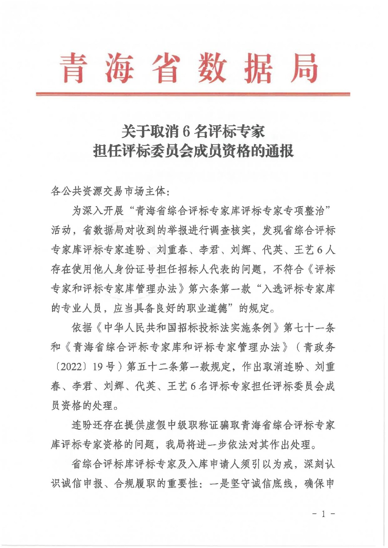 轉(zhuǎn)發(fā)青海省數(shù)據(jù)局關(guān)于取消6名評標(biāo)專家擔(dān)任評標(biāo)委員會成員資格的通報