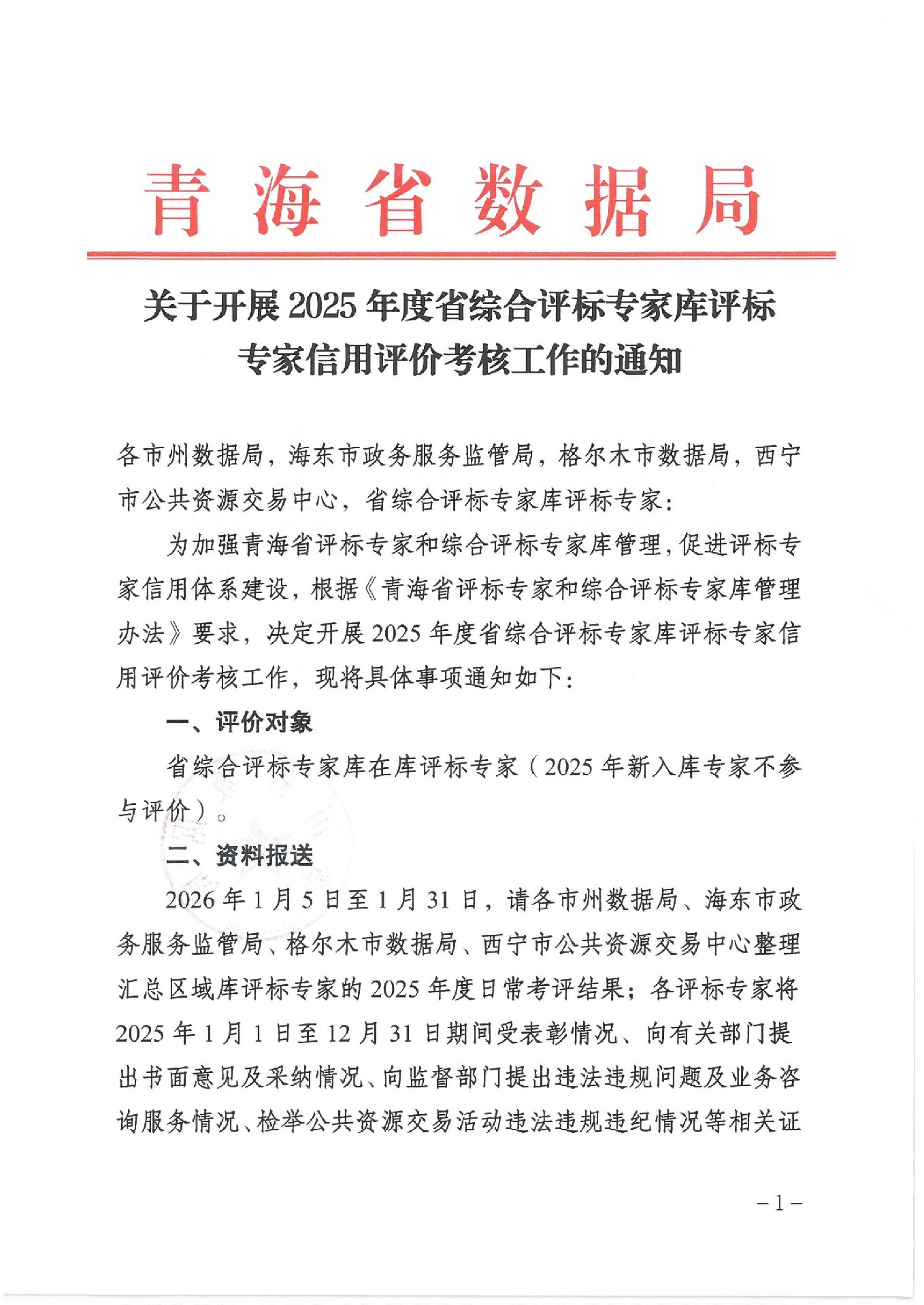 青海國德招標(biāo)代理有限公司轉(zhuǎn)發(fā)青海省數(shù)據(jù)局關(guān)于開展2025年度省綜合評標(biāo)專家?guī)煸u標(biāo)專家信用評價考核工作的通知
