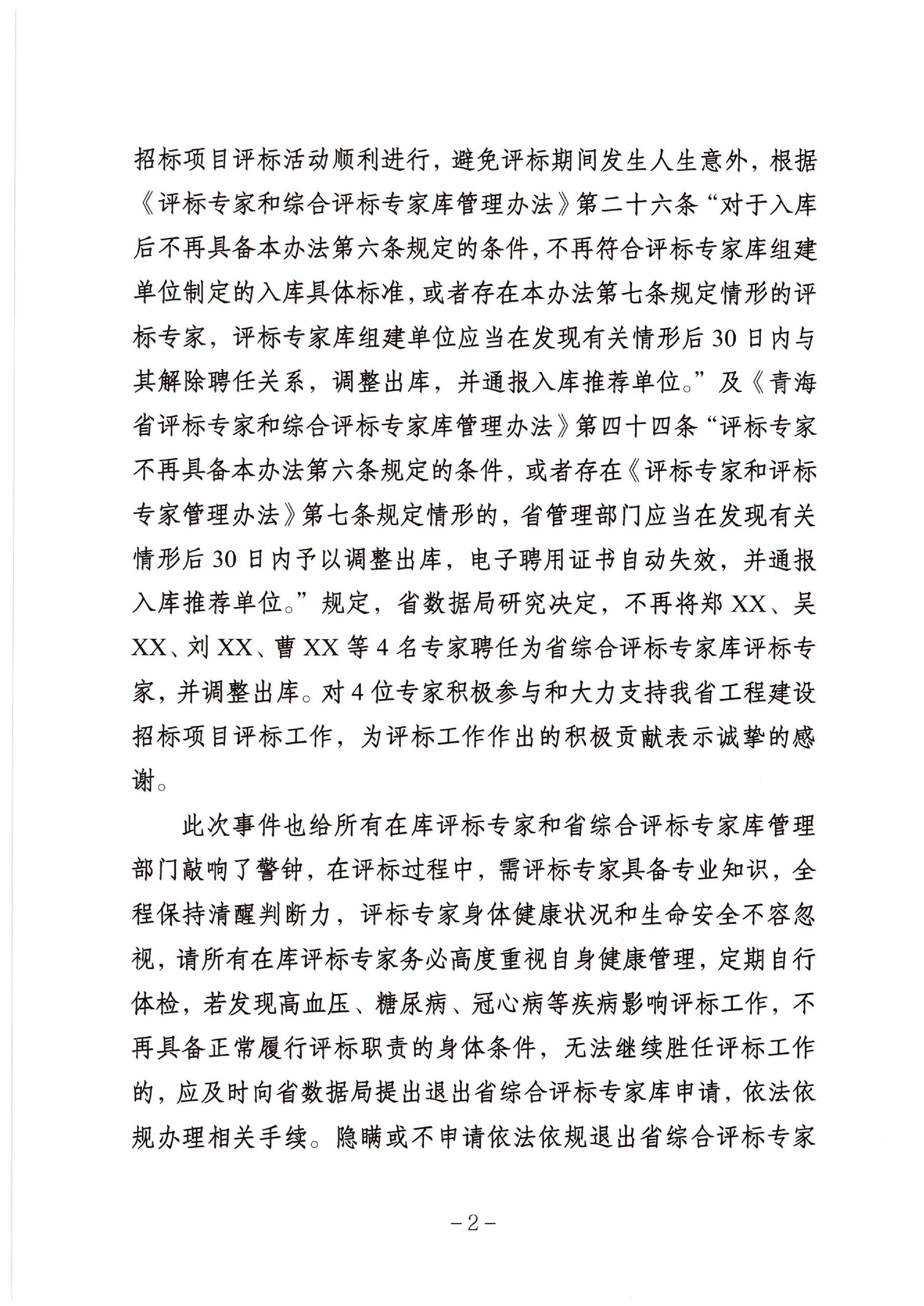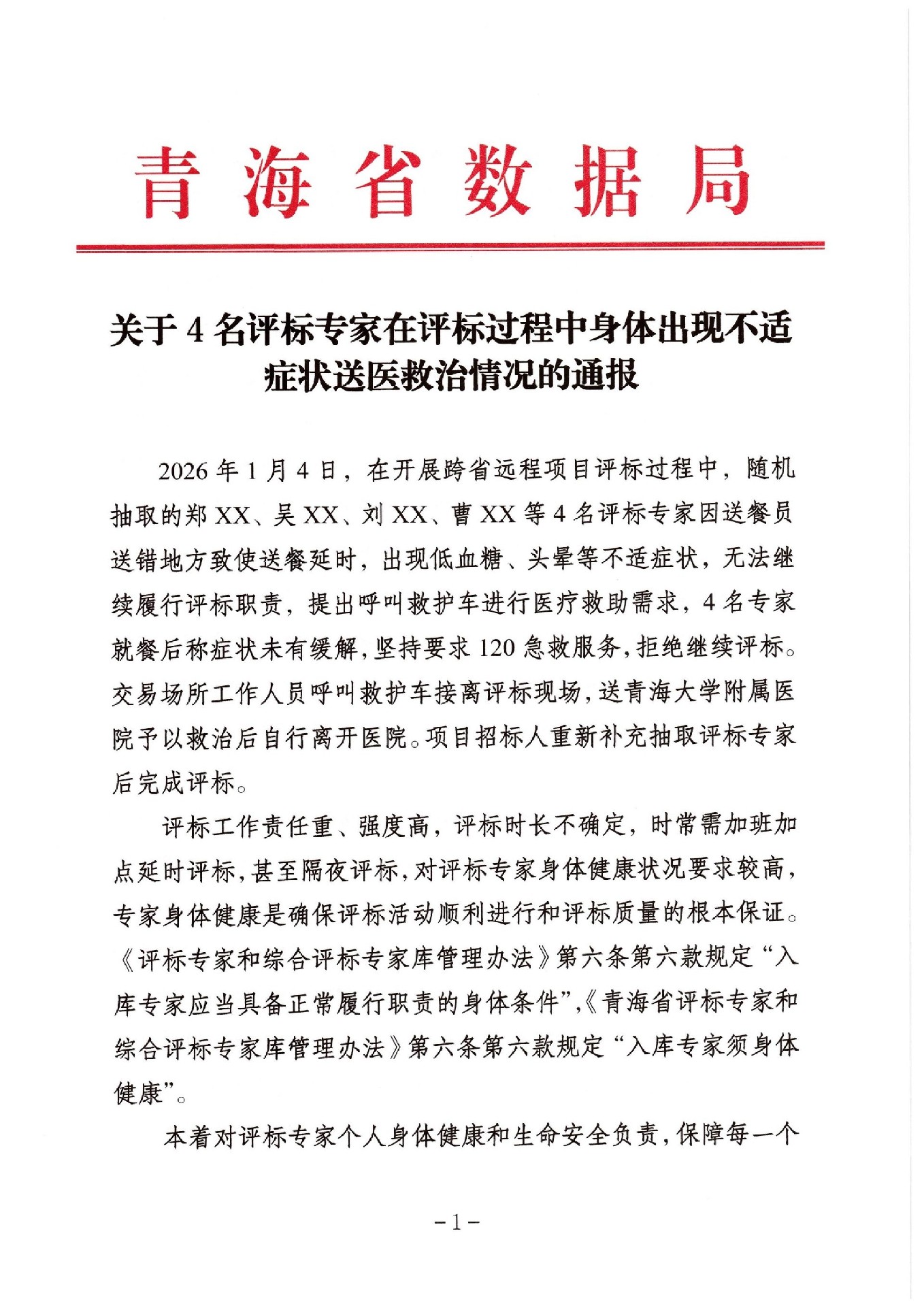青海國德招標代理有限公司轉(zhuǎn)發(fā)青海省數(shù)據(jù)局關(guān)于4名評標專家在評標過程中身體出現(xiàn)不適癥狀送醫(yī)救治情況的通報