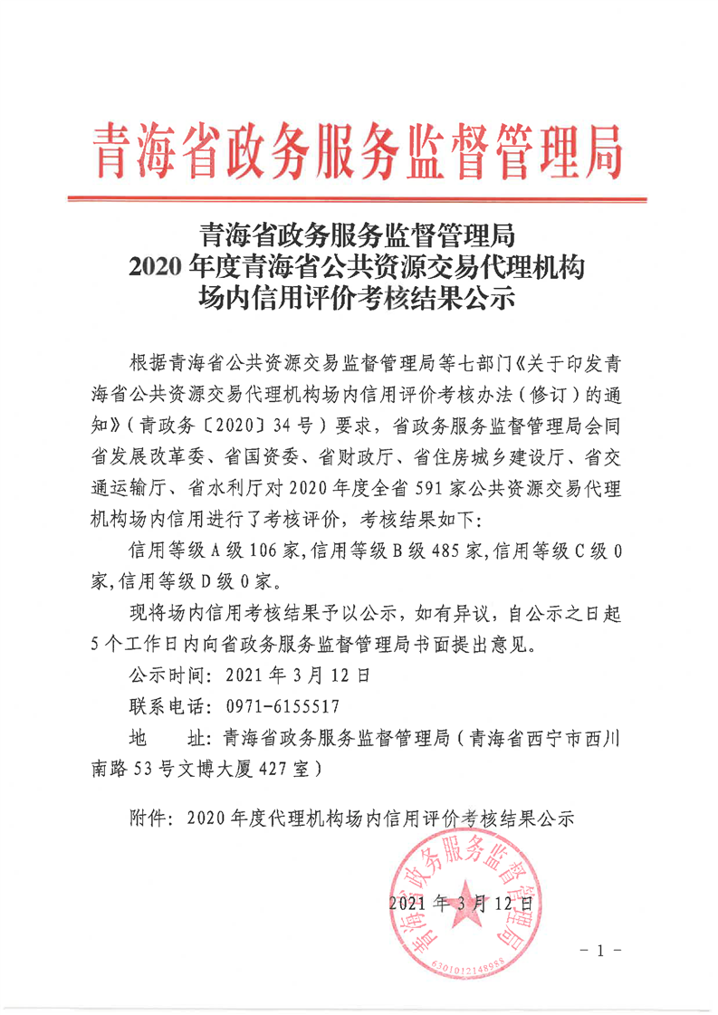青海省政務(wù)服務(wù)監(jiān)督管理局2020年度青海省公共資源交易代理機構(gòu)場內(nèi)信用評價考核結(jié)果公示